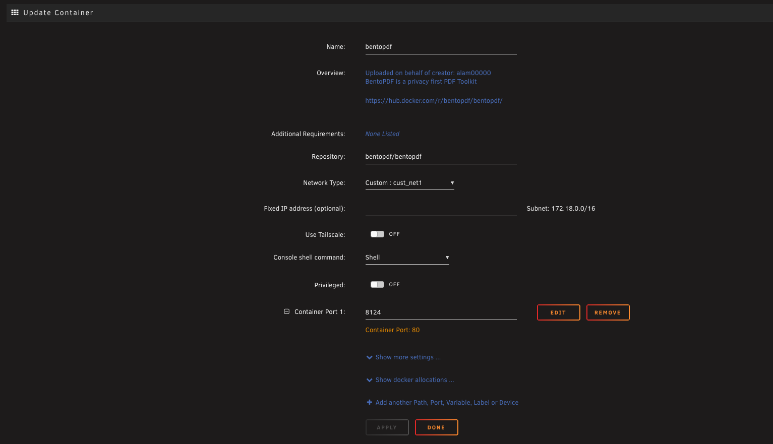 Section intitulĂ©e « DĂ©ploiement via Docker Compose »BentoPDF sâinstalle facilement via Docker, car il ne nĂ©cessite pas de base de donnĂ©es ou dâautre service.