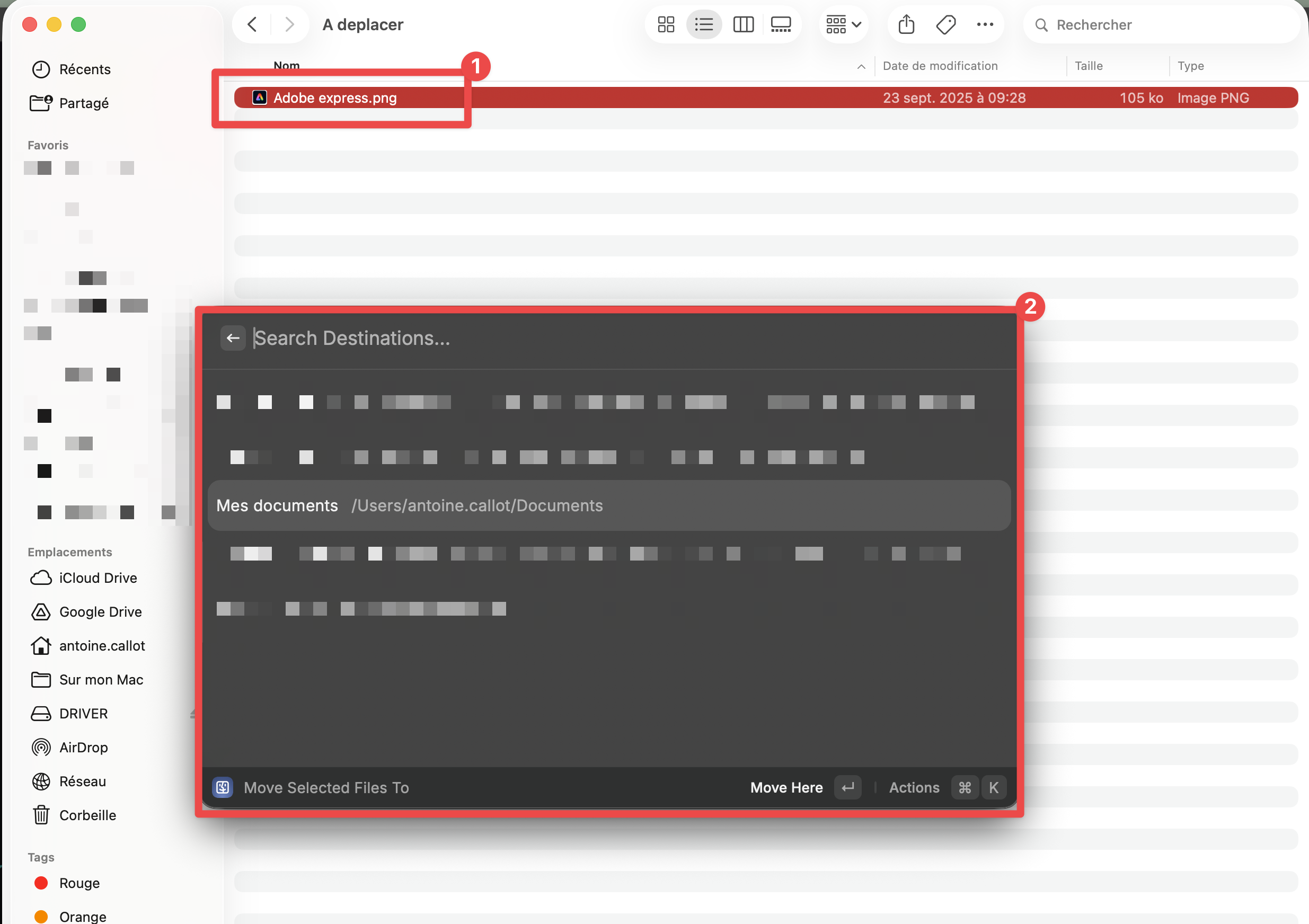 quand vous avez cliquer sur un fichier depuis le finder, selon si vous souhaitez copier ou déplacer un fichier dans le bon dossier :