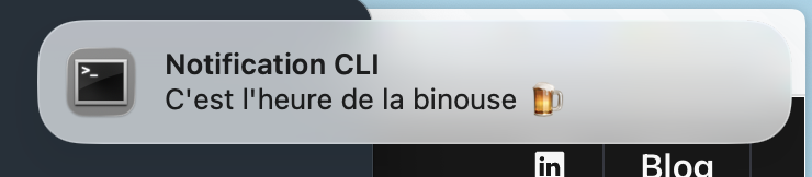 terminal-notifier -message "C'est l'heure de la binouse 🍺" -title "Notification CLI"Cela affichera une notification native dans le Centre de notifications macOS.