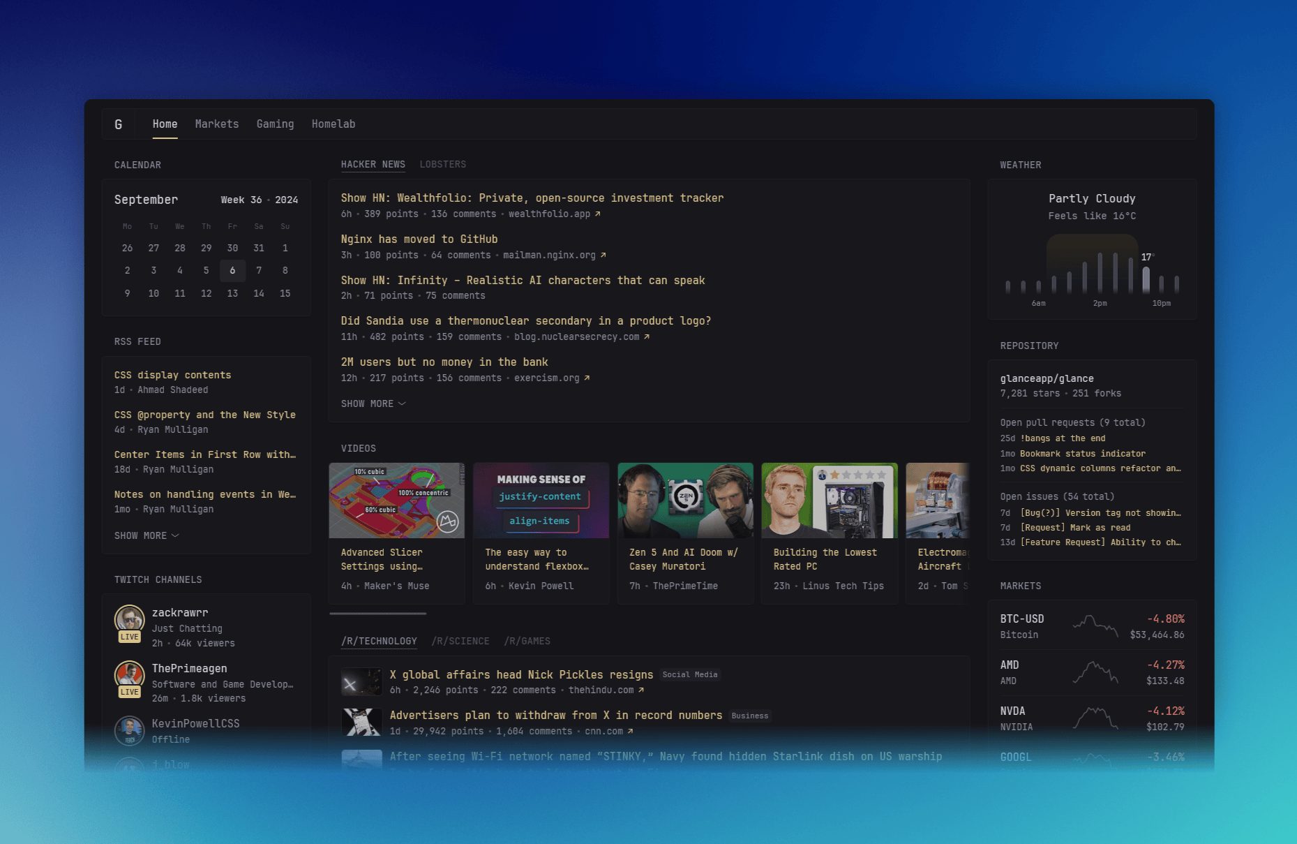 Glance est la solution parfaite pour créer un tableau de bord personnel pour accéder à vos services auto-hébergés et faciles à gérer avec un seul fichier YAML. En plus, il dispose de widgets notamment météo, suivi de flux RSS, suivi de chaînes YouTube, qui peuvent être très pratiques.