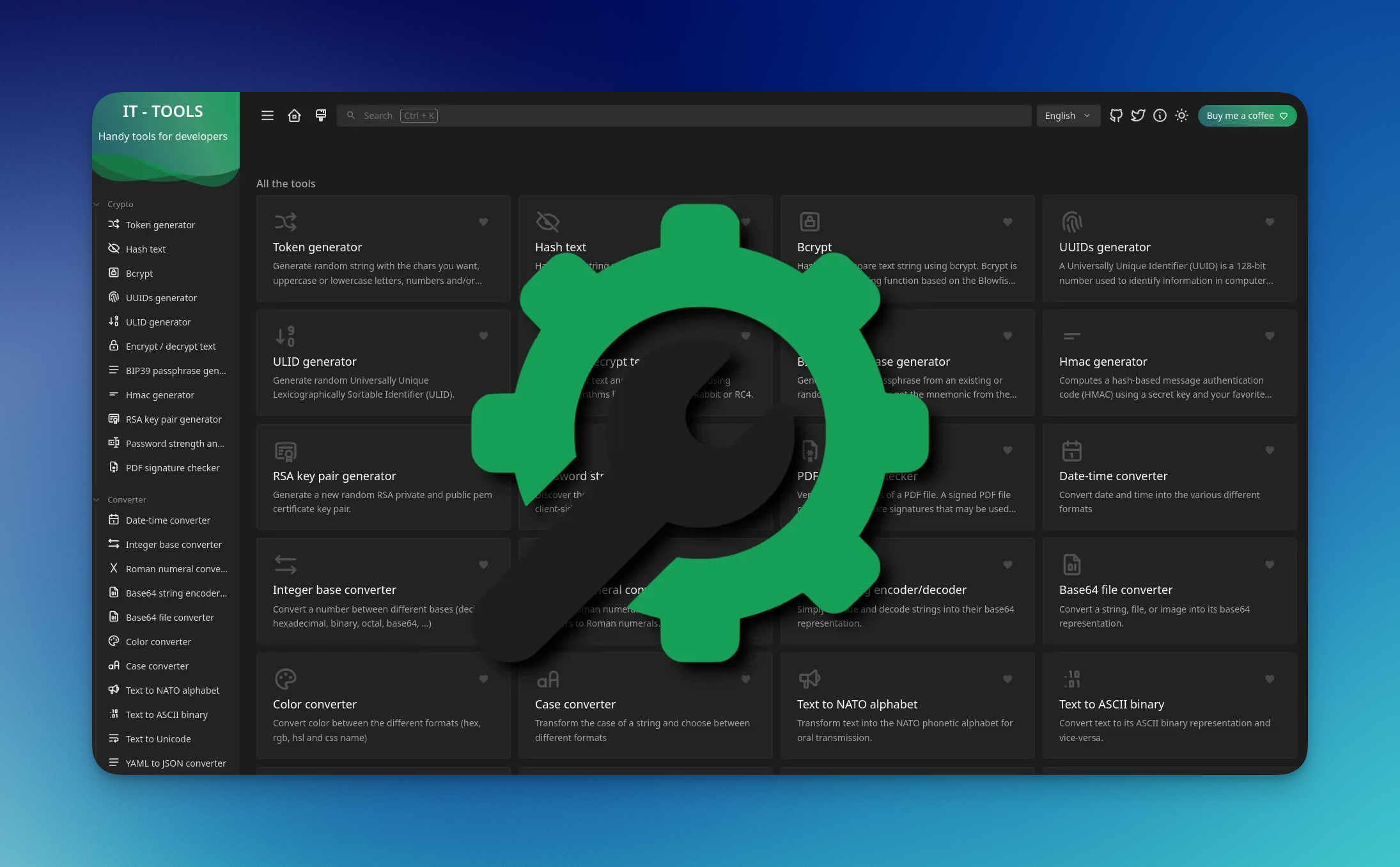 Un ensemble d’outils pour les “TECHGUYS” comme un convertisseur docker->docker-compose, des convertisseurs color, unicode, xml to json, des generateurs de token, etc. Bref, un outil super pour les Devs, Sysadmins ou toute personne travaillant dans l’IT.