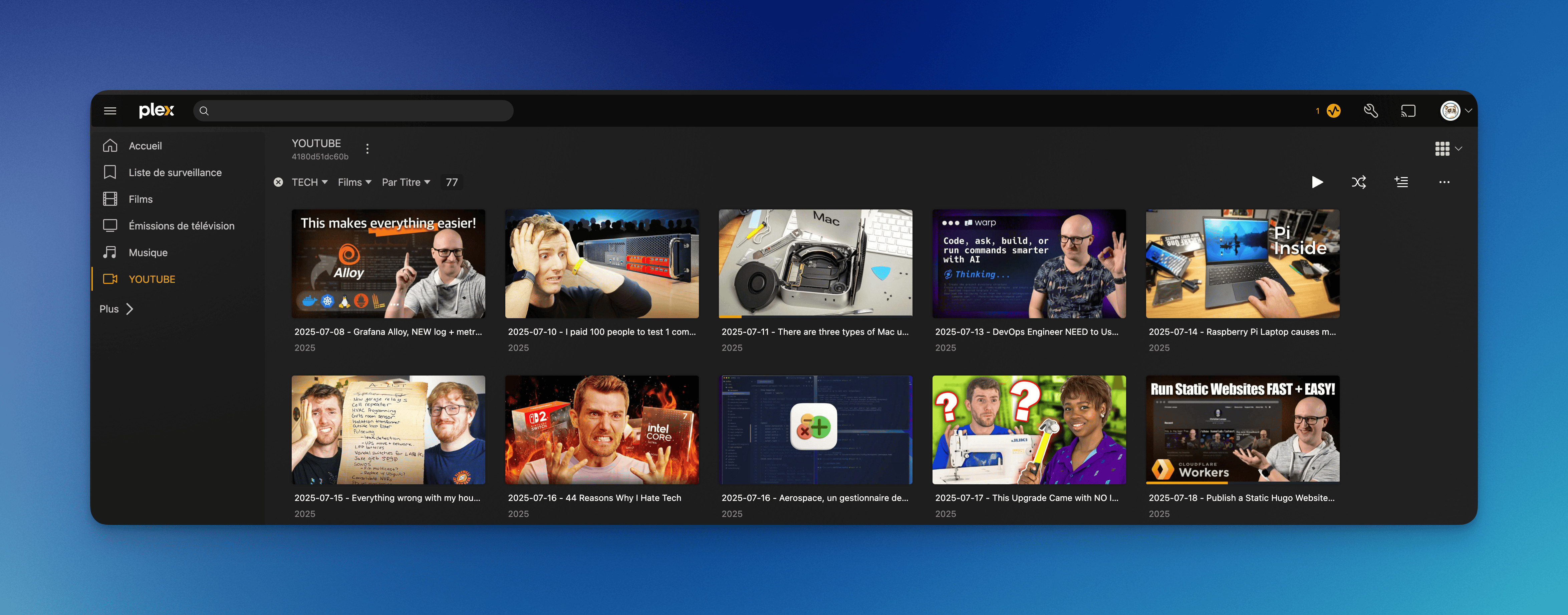 J’en ai déjà parlé dans un autre article, mais cela me permet de télécharger certaines chaînes ou certaines playlists YouTube pour les retrouver directement sur Plex. J’ai également une playlist que j’ai appelé “regarder plus tard” que je télécharge automatiquement. Cela évite d’avoir des publicités, notamment sur Apple TV, et de pouvoir télécharger les vidéos YouTube en mode hors ligne quand je prends le train.