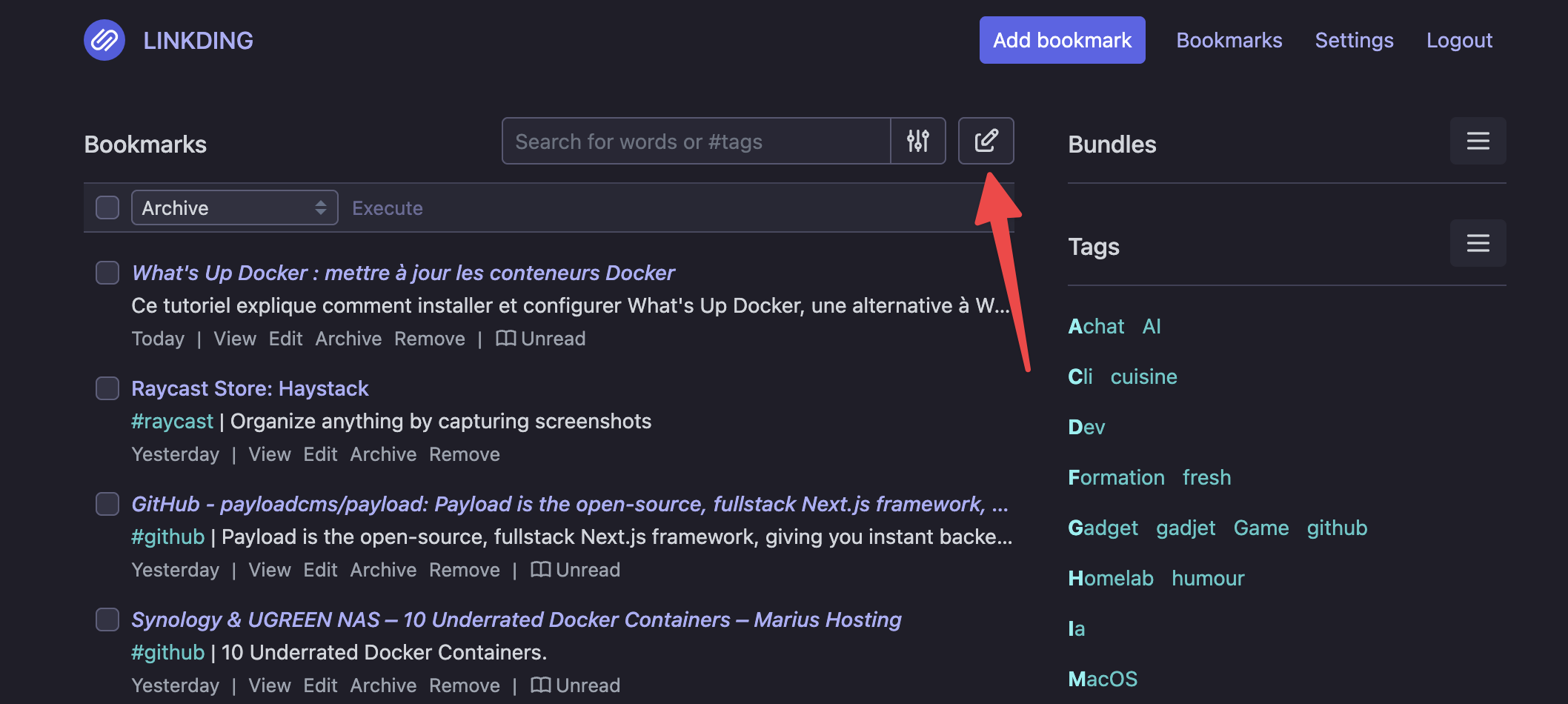Section intitulée « Utilisation de Linkding »Linkding est assez simple à utiliser :