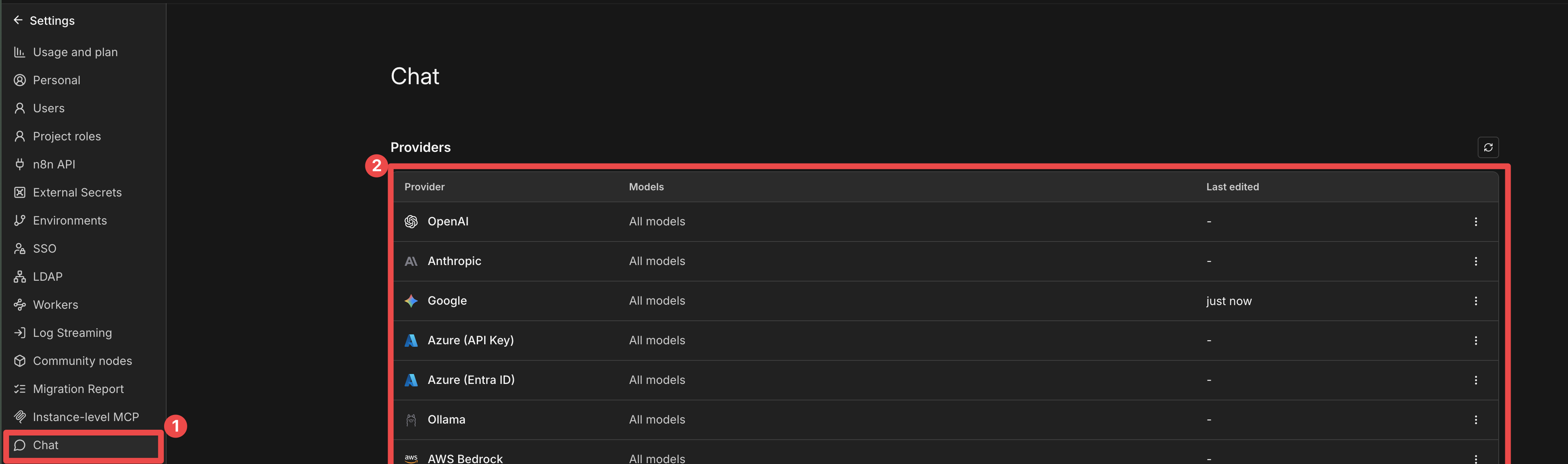 Pour pouvoir créer ce chat, vous devez ajouter un fournisseur (provider) depuis Settings > Chat parmi la liste des fournisseurs (provider) associés.
