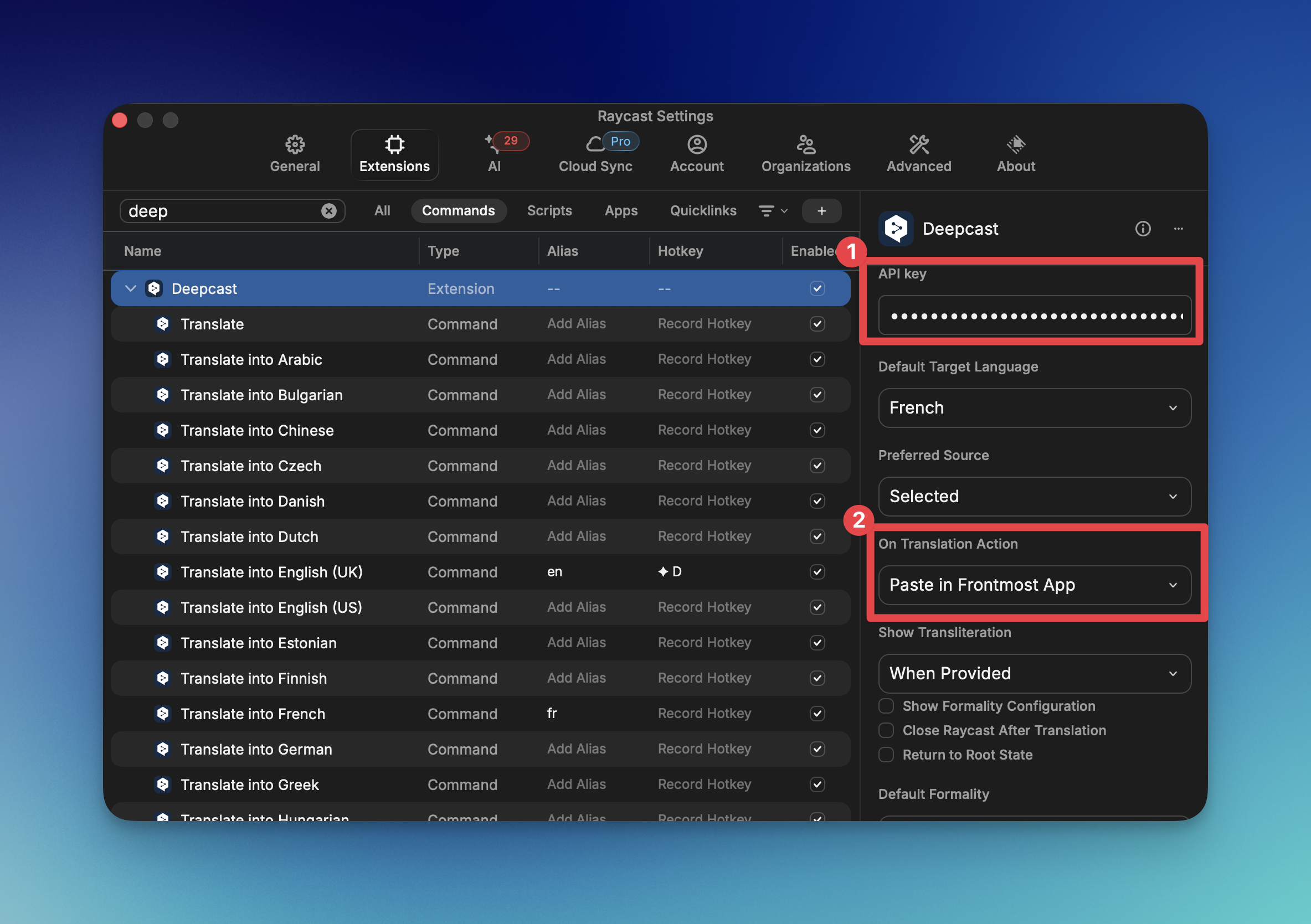 Section intitulée « 3. Paramétrage »Une fois l’extension installée, ouvrez les réglages de DeepCast dans Raycast (Command + ,). Voici la configuration optimale pour un workflow fluide :