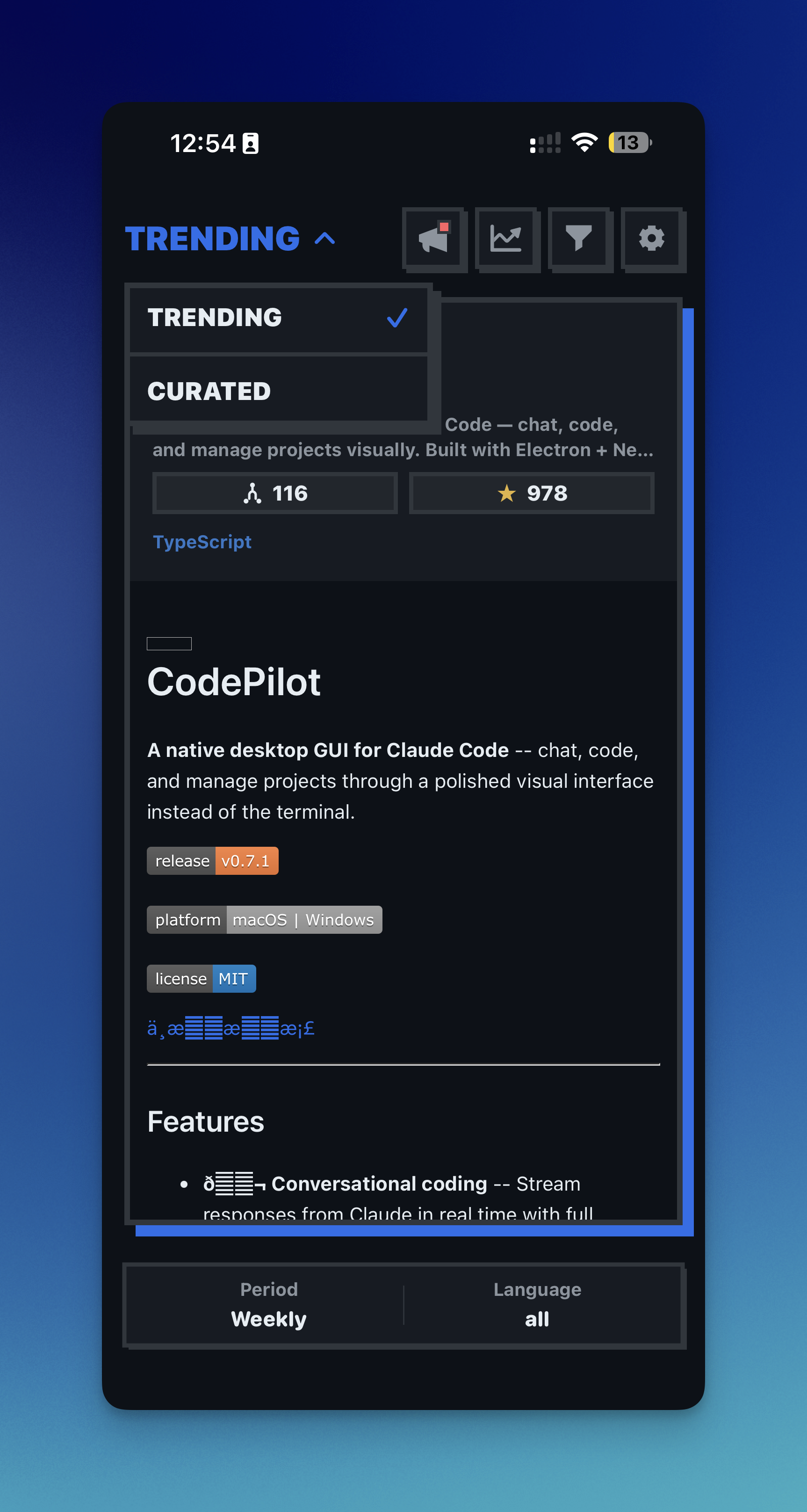 Le concept est simple : une interface de “swipe” intuitive pour trier les dépôts GitHub. Swipe à droite pour mettre en favori (Star), swipe à gauche pour passer au suivant. C’est efficace, et c’est surtout un excellent moyen de découvrir des “repos-pépites”.