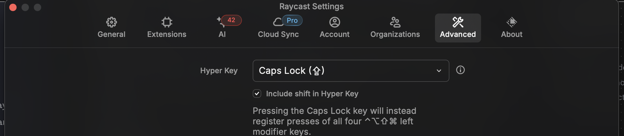 Pour configurer une hyperkey rendez-vous dans Raycast Settings > Advanced :