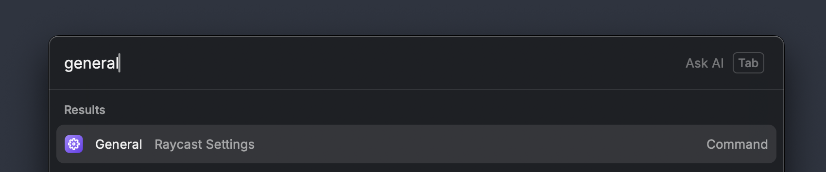Section intitulée « Les paramètres de Raycast à modifier »Tout d’abord pour accéder aux paramètres dans Raycast, rechercher “Général” dans la barre de recherche :