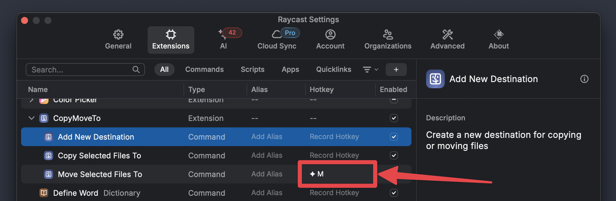 Comme vous pouvez le voir dans cet exemple, dans l’extension “CopyMoveTo” la commande “Move Selected Files To” j’ai mis le raccourci “hyperkey + m” (“m” pour move dans ma tête).
