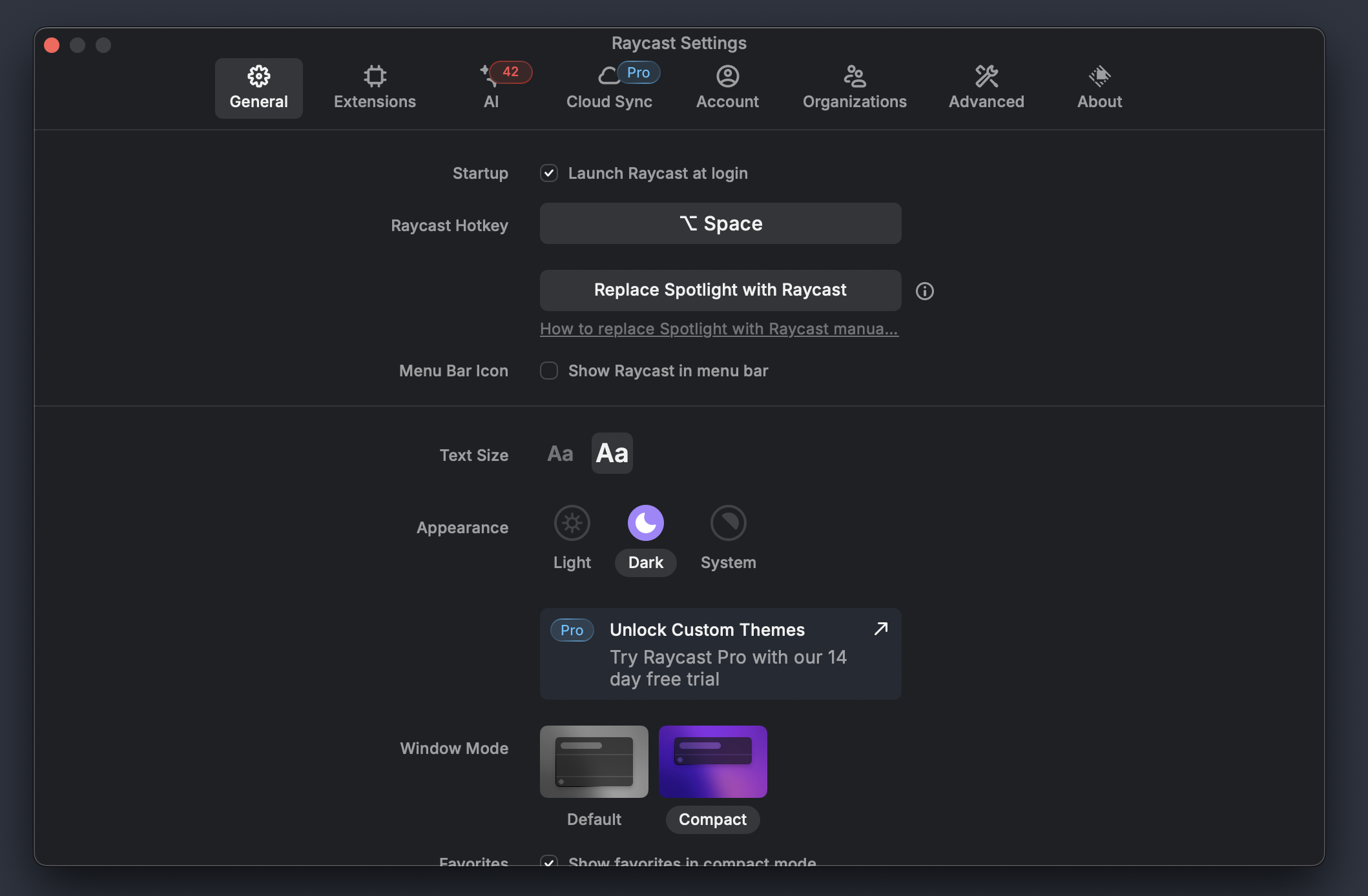 - Startup -> “Lauch Raycast at login” pour le lancer au démarrage.