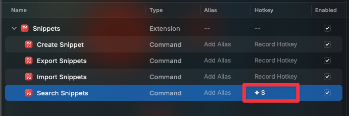 Section intitulée « Mettez un raccourci pour lancer le menu des snippets »Enfin personnellement vu que j’utilise énormément les snippets, j’utilise un raccourci pour lancer le menu de mes snippets vous pouvez modifier ceci dans Extensions > Hotkey.